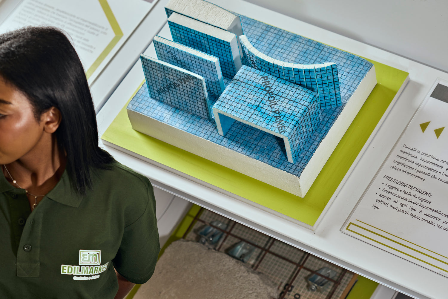 L’area è organizzata per facilitare la comprensione dei prodotti e dei loro sistemi applicativi: dai materiali per isolamento e impermeabilizzazione, alle soluzioni per pareti, pavimenti e coperture.